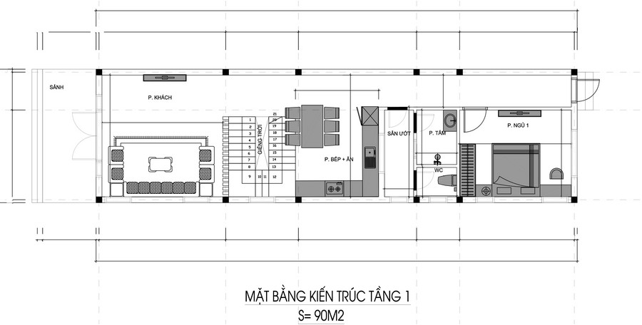Tầng 1: 1 phòng khách, 1 phòng bếp + ăn, 1 phòng ngủ, 1 phòng tắm, wc và sân rửa.